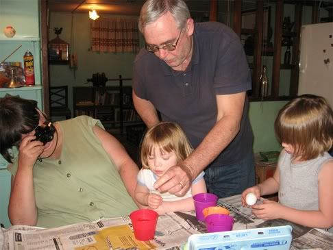 The great-grandkids: Emma and Abbie learning to dye eggs the way my generation did. {Of course, Heidi has the camera in front of her face. :) } And Becky with Katie Mae, their Grandma Mae watching from behind.